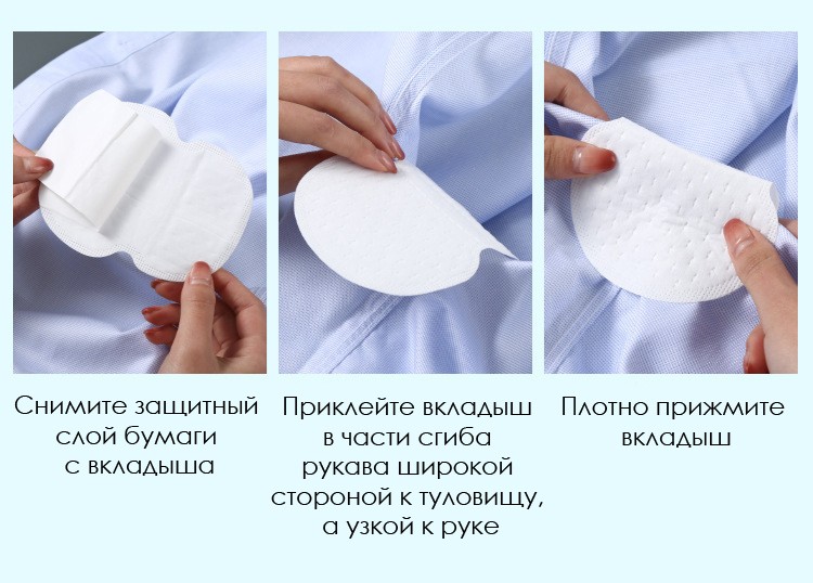 Способ применения: 1) Выверните одежду наизнанку и разгладьте ткань от складок в области подмышек; 2) Снимите защитный слой бумаги с вкладыша; 3) Аккуратно приклейте вкладыш в части сгиба рукава одежды широкой стороной к туловищу, а узкой к руке; 4) Плотно прижмите вкладыш, а затем прогладьте его пальцами несколько раз; Для максимальной фиксации вкладыша, старайтесь приклеить его к одежде с первого раза, без повторных попыток. 5) Повторите последовательность для второго вкладыша; 6) После окончания использования отклейте вкладыш от одежды медленным движением.