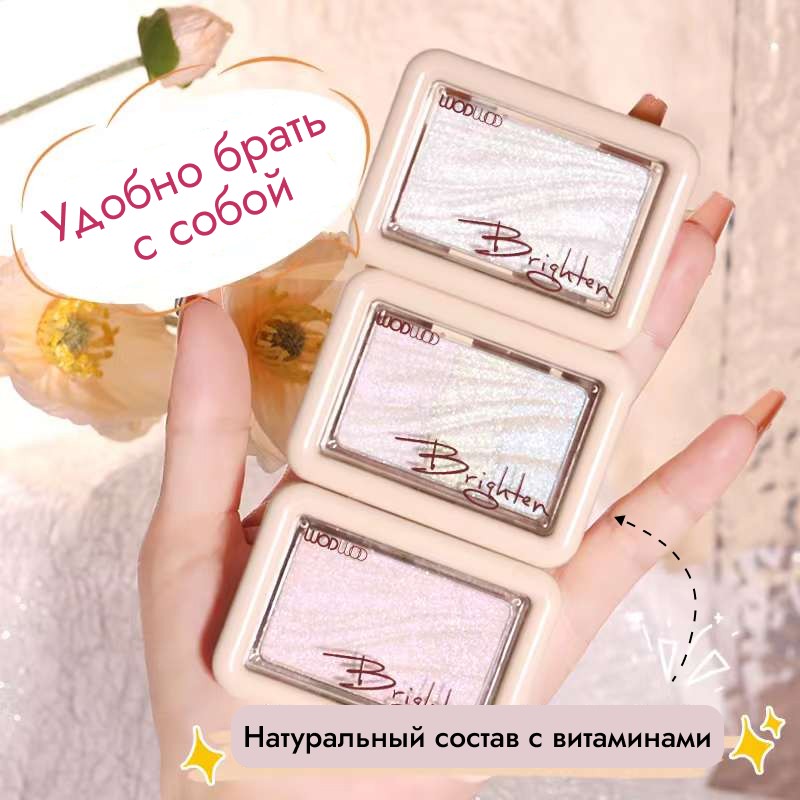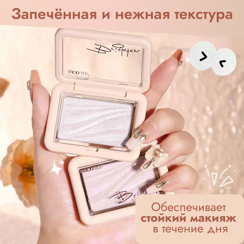 Хайлайтер для лица с запеченной текстурой состоит из двух шиммерных оттенков с мелкими блестками. Невесомая текстура сухого хайлайтера идеально ложится на любую кожу подчеркивая её естественную красоту и придавая ей загадочное сияние. Хайлайтер неотъемлемая часть контуринга лица, он легко наносится и растушевывется кистью для макияжа, создавая эффект "мягкого фокуса". Сухой хайлайтер имеет компактную упаковку, которую удобно брать с собой. Для лучшего эффекта рекомендуется наносить хайлайтер кистью для макияжа на выступающие части лица: область над бровями, скулы, пространство над верхней губой, кончик носа. Небольшой лайфхак - если нанести хайлайтер в уголки глаз, ваш взгляд станет более выразителным.