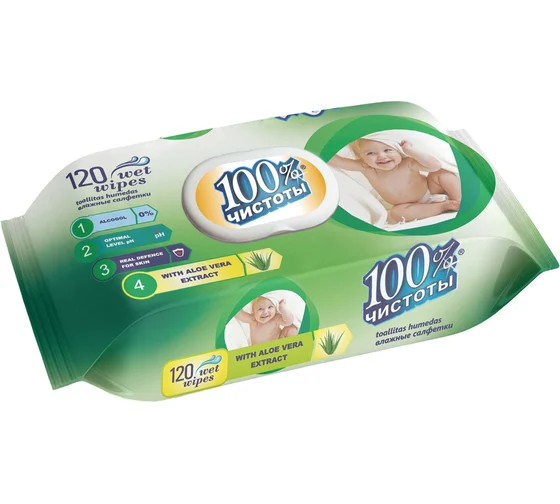 100% Чистоты Влажные салфетки (120шт) для детей с экст. Алоэ Вера п/п клапан.
