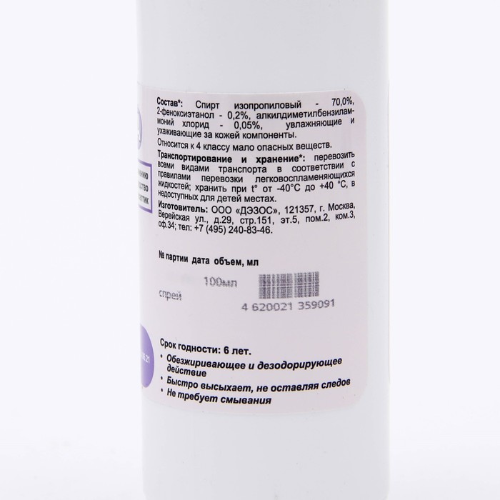 Состав: спирт изопропиловый – 70,0%, 2-феноксиэтанол – 0,2%, алкилдиметилбензиламмоний хлорид – 0,05%, а также функциональные добавки, увлажняющие и ухаживающие за кожей компоненты.