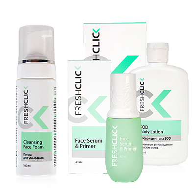 Акция1+1=3 Купи набор средств FreshClick: пенку для умывания + сыворотку-праймер для лица – В ПОДАРОК лосьон для тела SOD!