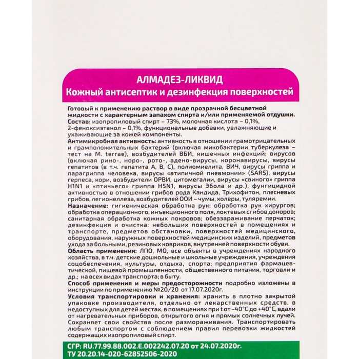 * Средство «Алмадез-ликвид» должно применяться непосредственно из оригинальной упаковки изготовителя. Разбавление средства водой или другими растворителями, а также смешивание с другими средствами не допускается.