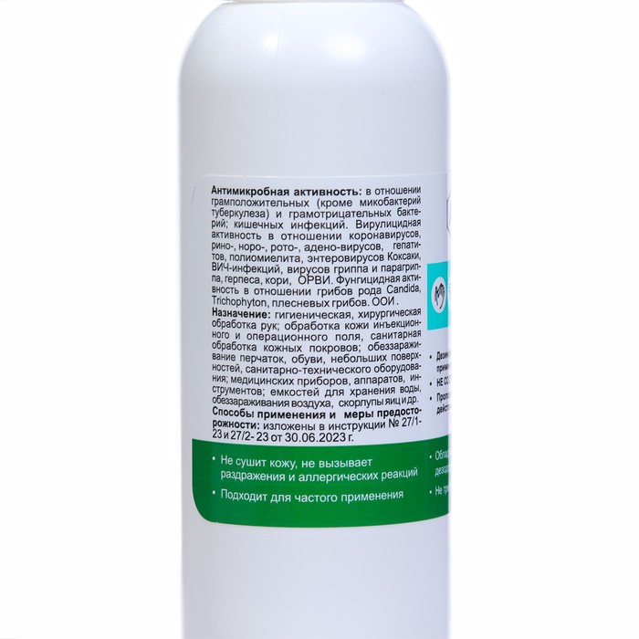 Средство обладает антибактериальной активностью в отношении грамположительных (включая микобактерии туберкулёза) и грамотрицательных бактерий, вирулицидной активностью (включая вирусы энтеральных и парентеральных гепатитов, полиомиелита, ВИЧ, вирусов "атипичной пневмонии" (SARS), герпеса, вирусов гриппа, в том числе гриппа H1N1, гриппа H5N1 и др.) и фунгицидной активностью в отношении грибов рода Кандида и дерматофитов.