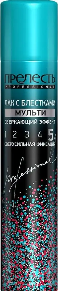 Лак с блестками Прелесть Professional поможет воплотить любые эксперименты и креативные идеи при создании неповторимого образа. Надежная фиксация до 24 часов. Лак предназначен для придания мерцающего эффекта волосам. Не утяжеляет укладку, не склеивает волосы. Легко смывается водой и удаляется расческой. Цвет блесток: мульти. Alcohol Denat. (45,07 % vol.), Butane, Propane, Acrylates/ Octylacrylamide Copolymer,Glitters, Aminomethyl Propanol, Isobutane, Parfum, Limonene, Linalool, Butylphenyl Methylpropional.
