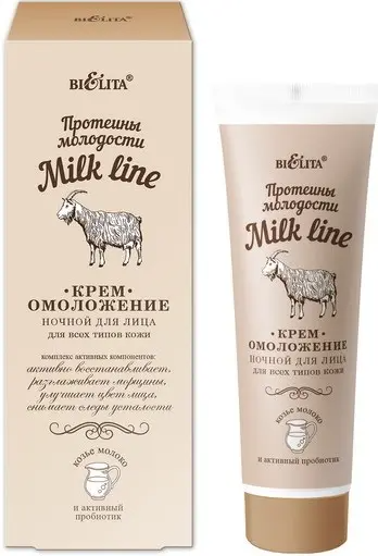 Крем-омоложение заботится о красоте кожи во время ночного сна, стимулирует обменные процессы в клетках и способствует регенерации. Формула с козьим молоком и активным пробиотиком обеспечивает интенсивное питание, насыщает кожу витаминами, разглаживает морщины. Утром кожа выглядит отдохнувшей, свежей и сияющей. Вода, масло Cocos Nucifera (кокоса), цетеариловый спирт, полисорбат 60, ПЭГ-100 стеарат, цетеарет-25, масло Helianthus Annuus (подсолнечное), цетеариловый спирт, масло вазелиновое, циклопентасилоксан, циклогексасилоксан, бетаин, этилгексилизононаноат, сополимер винилпирролидона и акрилоилдиметилтаурата аммония, глицерилстеарат, изопропилмиристат, масло зародышей Triticum vulgare (пшеницы), токоферилацетат, БГТ, метилпарабен, парфюмерная композиция, экстракт корня Zingiber Officinale (имбиря), экстракт Camelia Sinenensis (зеленого чая), пропилпарабен, экстракт козьего молока, экстракт дрожжей, глицерин, лецитин, сорбитол, ксантановая камедь, аскорбилфосфат натрия, токоферилацетат, глицериллинолеат, глицериллиноленат, ретинилпальмитат, 2-бром-2-нитропропан-1,3-диол, Lactoccocus Lactis, Lactoccocus Cremoris, Lactococus Biovar Diacetilactis, Leuconostoc Mesenteroides, лимонен.