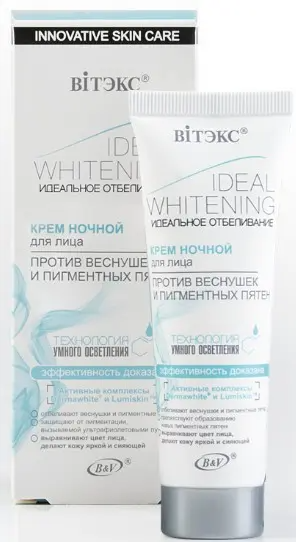 Теперь для осветления темных пигментных пятен и веснушек достаточно просто нанести ночной отбеливающий крем перед сном. Ночной крем обеспечивает активное отбеливание веснушек и пигментных пятен на коже во время сна, когда кожа находится в состоянии покоя и наиболее восприимчива к действию активных веществ.Пока Вы спите,уникальная технология «умного» осветления кожи комплексов Dermawhite® и Lumiskin™ активно работает: происходит определение пигментированных участков, которым необходимо осветление и прицельное воздействие на них. Крем помогает снизить синтез меланина, минимизировать появление пигментных пятен и обеспечивает отбеливание кожи.Натуральный растительный экстракт толокнянки усиливает отбеливающий эффект и увлажняет кожу. Вода, цетиловый спирт, глицерилстеарат, ПЭГ-75 стеарат, цетет-20, стеарет-20, вазелиновое масло, глицерилтрикаприлат/капрат, маннитол, глюконат натрия, лимонная кислота, цитрат натрия, экстракт листьев Walteria Indica (вальтерии), декстрин, ферулиновая кислота, диметикон, каприлилметикон, изопропилпальмитат, цетеариловый спирт, Экстракт листьев Arctostaphylos Uva-Ursi (толокнянки), диацетилболдин, масло Sesamum Indicum (кунжута), воск пчелиный синтетический, масло Butyrospermum parkii (ши), циклопентасилоксан, кроссполимер диметикона, глицерилстеарат, сополимер акрилоилдиметилтаурата аммония и винилпирролидона, изопропилмиристат, масло зародышей Triticum vulgare (пшеницы), токоферилацетат, БГТ, метилпарабен, аллантоин, парфюмерная композиция, пропилпарабен, ксантановая камедь, 2-бром-2-нитропропан-1,3-диол, бутилфенилметилпропиональ, лимонен, гераниол, гексилциннамаль, линалол.