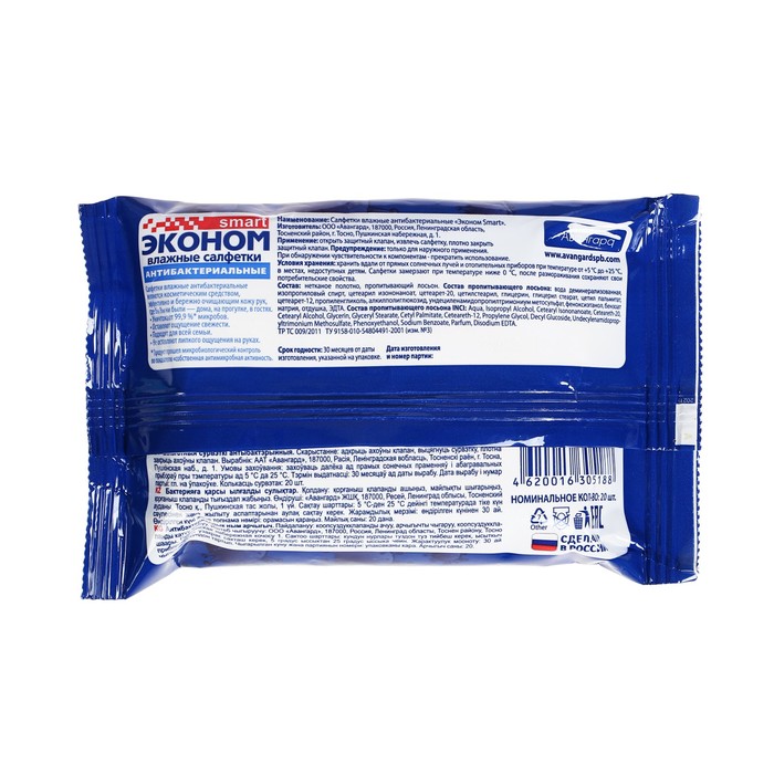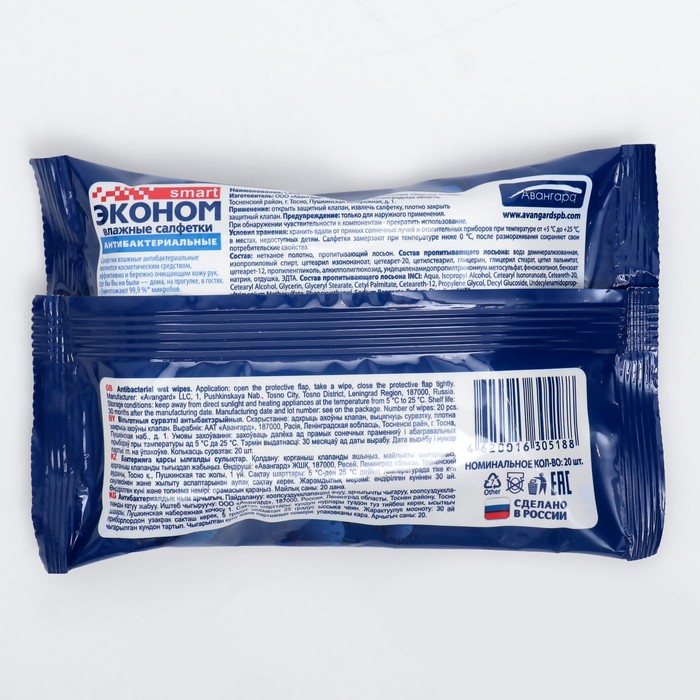 Влажные салфетки «Эконом» smart, антибактериальные, с содержанием изопропилового спирта, 20 шт.