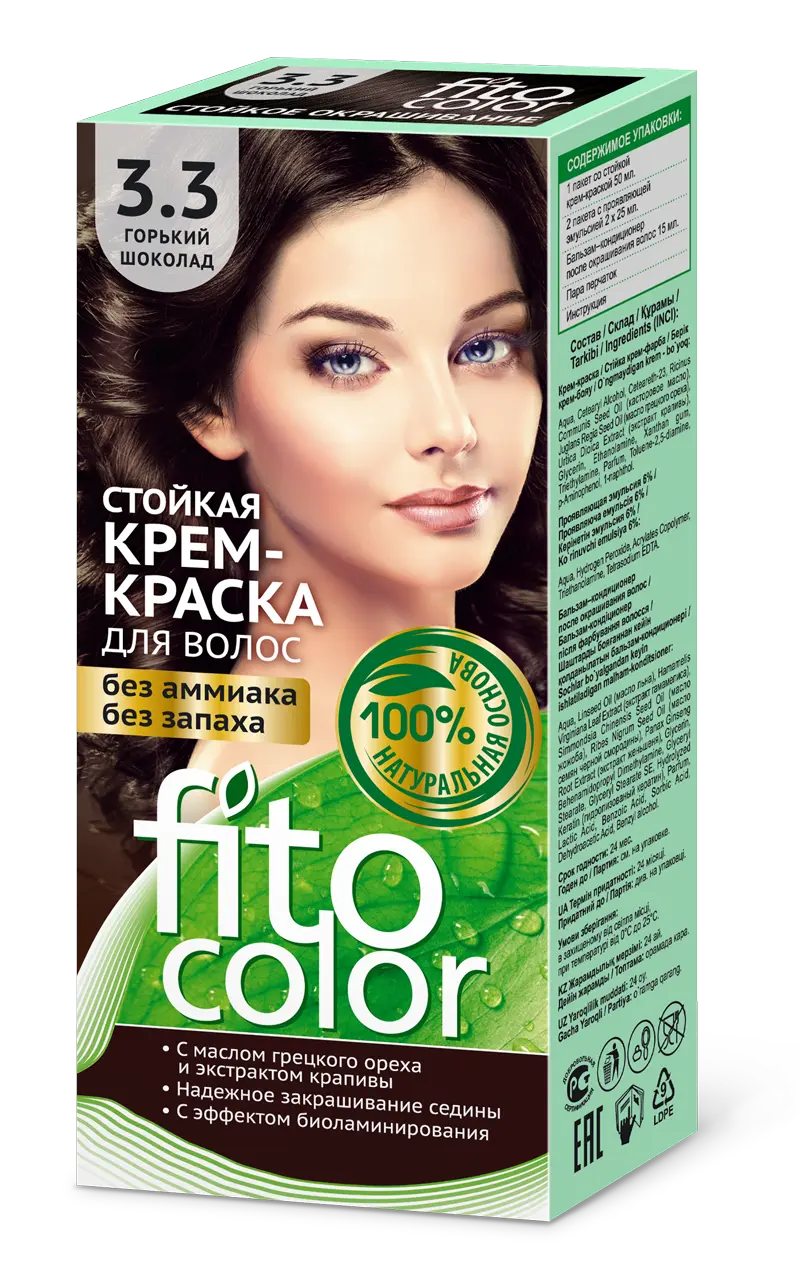 Стойкая крем-краска для волос (цвет горький шоколад) FitoColor- природная красота для Ваших волос! Единственная крем-краска, разработанная на основе натуральных природных компонентов! Нежная кремовая текстура краски, обволакивая каждый волос, глубоко проникает в его структуру и окрашивает в сочные, объемные, яркие, цвета. Крем-краска идеально закрашивает седину! Входящие в состав натуральные масла и экстракты растений питают, укрепляют и восстанавливают локоны, придают им гладкость, эластичность и объем. Juglans Regia Seed Oil (масло грецкого ореха), Urtica Dioica Extract (экстракт крапивы), Glycerin, Ethanolamine, Xanthan gum, Triethylamine, Parfum, Toluene-2,5-diamine, p- Aminophenol, 1-naphthol.