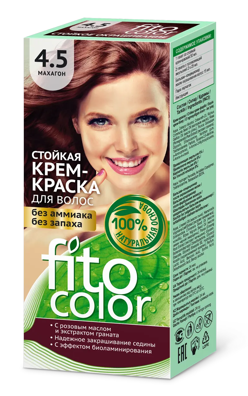 Стойкая крем-краска для волос (цвет махагон) FitoColor- природная красота для Ваших волос! Единственная крем-краска, разработанная на основе натуральных природных компонентов! Нежная кремовая текстура краски, обволакивая каждый волос, глубоко проникает в его структуру и окрашивает в сочные, объемные, яркие, цвета. Краска (цвет махагон) идеально закрашивает седину! Входящие в состав натуральные масла и экстракты растений питают, укрепляют и восстанавливают локоны, придают им гладкость, эластичность и объем. Крем-краска: Aqua, Cetearyl Alcohol, Ceteareth-23, Ricinus Communis Seed Oil (касторвое масло), Rosa Gallica Oil (масло розы), Punica Granatum (Pomegranate) Peel Extract (экстракт граната), Glycerin, Ethanolamine, Xanthan gum, Triethanolamine, Parfum, Toluene-2,5-diamine, p- Aminophenol, 4-Amino-2-Hydroxytoluene, . 4-Amino-m-cresol.