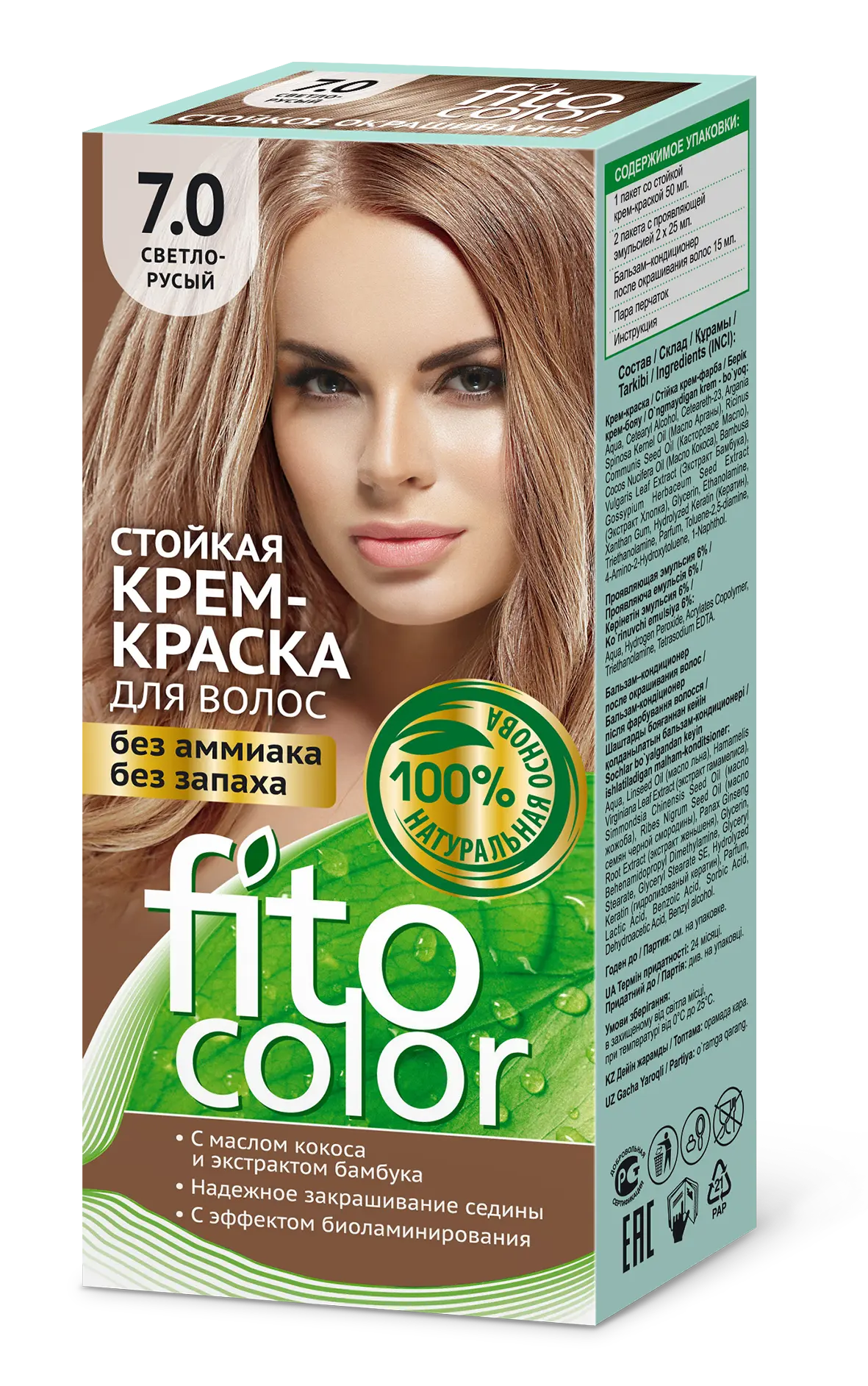 Стойкая крем-краска для волос FitoColor- природная красота для Ваших волос! Единственная крем-краска, разработанная на основе натуральных природных компонентов! Нежная кремовая текстура краски, обволакивая каждый волос, глубоко проникает в его структуру и окрашивает в сочные, объемные, яркие, цвета. Крем-краска идеально закрашивает седину! Входящие в состав натуральные масла и экстракты растений питают, укрепляют и восстанавливают локоны, придают им гладкость, эластичность и объем. Цвет 7.0 Светло-Русый Aqua, Cetearyl Alcohol, Ceteareth-23, Ricinus Communis Seed Oil (касторвое масло), Chamomilla Recutita Oil (масло ромашки), Soluble Collagen (коллаген), Glycerin, Ethanolamine, Xanthan gum, Triethanolamine, Parfum,Toluene-2,5-diamine, p-Aminophenol, 4-Amino-2-Hydroxytoluene.