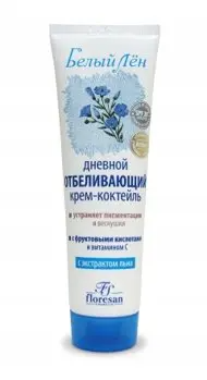 Floresan Белый лен Крем-коктейль отбеливающий дневной. Защита от солнца. 75 мл с усиленным комплексом UVA/UVB фильтров и мощными депигментирующими компонентами разработан для защиты кожи от солнца и борьбы с пигментацией, вызванной воздействием УФ лучей.Фруктовые кислоты отшелушивают верхний слой эпидермиса, устраняя избыточную пигментацию, экстракт огурца и витамин С осветляют и выравнивают общий тон кожи, предотвращая появление веснушек и пигментных пятен. Экстракт семян льна питает и увлажняет кожу, делая ее мягкой и эластичной. Результат – надежная защита от солнца + отбеливающий эффект! Отбеливает, подавляет выработку меланина, устраняет пигментацию, веснушки и красные пятна. Вода питьевая, масло кокосовое, этилгексил метоксициннамат, масло соевое, пропиленгликоль, воск эмульсионный, спирт цетеариловый, стеарат ПЭГ-8, диоксид титана, кислота молочная, диметикон, кислота лимонная, триэтаноламин, экстракт семян льна, экстракт огурца, аскорбилпальмитат, микрокар ПМ3, парфюмерная композиция, метилхлороизотиазолинон, метилизотиазолинон, кислота гиалуроновая, бензилсалицилат, гераниол, гексилциннамал, гидроксицитронеллаль.