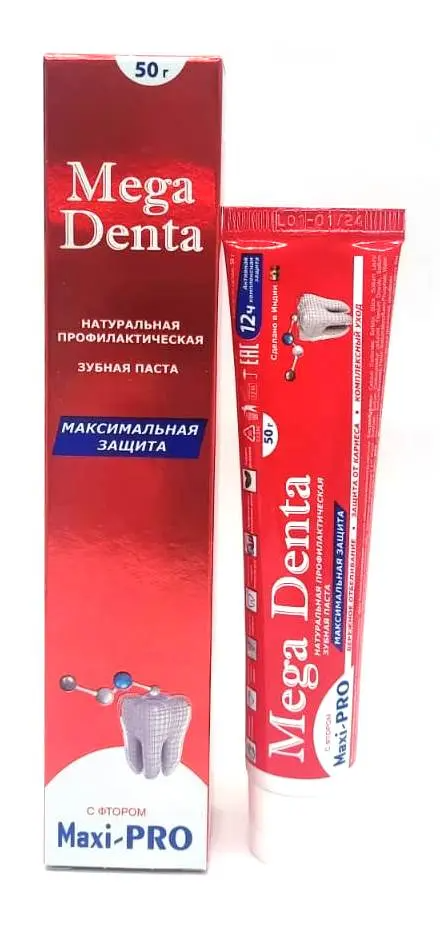 Megadenta Зубная паста Махі-Pro: Зубная паста Megadenta Maxi-Pro максимальная защита содержит уникальную формулу, состоящую из хомплекса инновационных и натуральных компонентов, обеспечивая при регулярном применении комплексный уход за полостью рта. Чтобы Ваши зубы были белоснежными, крепкими и сияли здоровьем.