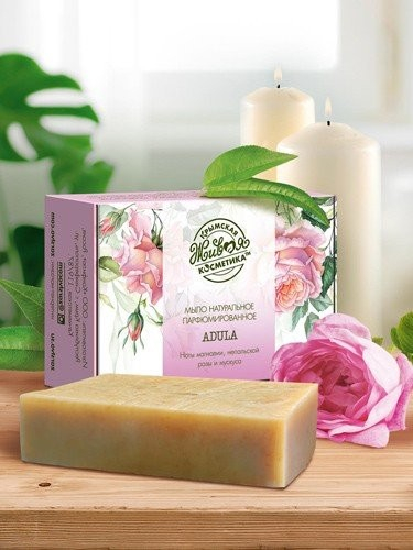 Мыло «Долина Роз», состав: омыленные растительные масла: пальмовое, кокосовое, оливковое, вода, масла миндальное, абрикосовое, лепестки эфиромасличных роз, экстракты шиповника, календулы, масла эфирные герани, пальмарозы, лаванды, гвоздики.