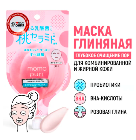"Японская маска для лица разработана специально для глубокого очищения кожи. Благодаря содержанию розовой глины и BHA кислот глубоко очищает поры, поглощает излишки себума и грязь, скопившихся в порах. Во время процедуры насыщает кожу пробиотиками, керамидами и витаминами А, С, Е. После применения маски кожа гладкая, свежая и упругая как персик. Упаковка рассчитана на 3 применения.