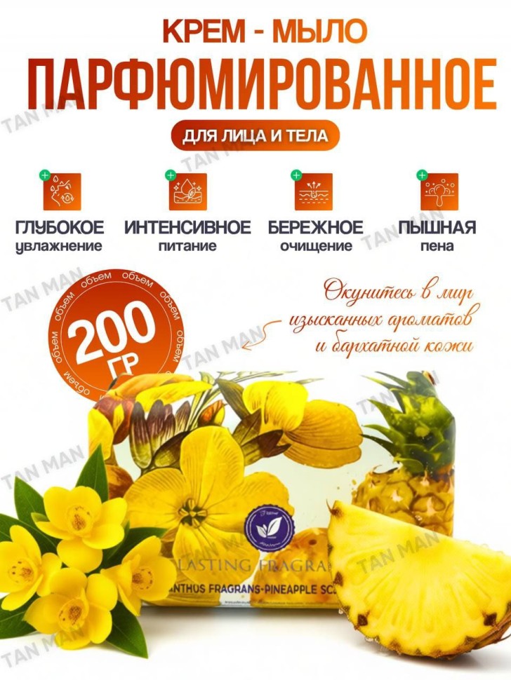 Сделано из различных масел и экстрактов Тропических цветов и фруктов. Нежная увлажняющая формула для всех типов кожи. Изготовлено из высококачественного натурального сырья, только чистые растительные масла, цветочные экстракты и ручная работа, без животных жиров, без консервантов и вредных ингредиентов. Мыло безопасно, протестировано на коже. Мыло прекрасно очищает кожу и поры от грязи и излишков кожного жира, обладает хорошим увлажняющим и смягчающим эффектами. Масла Оливы и Кокоса, фруктовые эссенции делают кожу мягкой и гладкой.