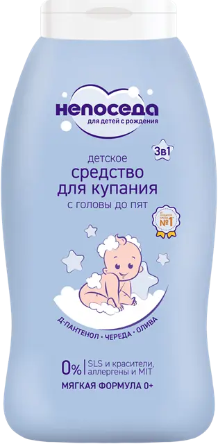 Универсальное средство для купания с чередой и оливой Непоседа создано специально для ухода за нежной кожей и волосами новорожденных.