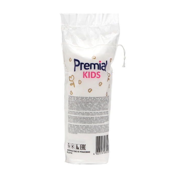 Детские ватные диски Premial состоят из 100% хлопка ручного сбора и изготовлены при помощи запатентованного гидроструйного метода. Смысл данного метода заключается в скреплении волокон хлопка при помощи струй воды, подаваемых под давлением с обоих сторон полотна. Этот способ помогает достичь максимально надежного плотного соединения хлопковых волокон и отсутствия ворсистости на их поверхности.