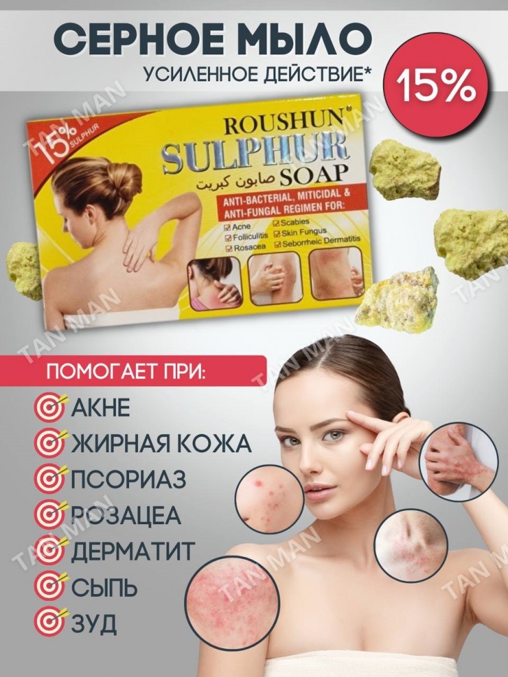 Средство для ухода за проблемными участками кожи лица и тела с 15% Серой. Антибактериальный, Акарицидный и Противогрибковый уход при: Акне, Фолликулите, Розацеа, Чесотке, Грибке кожи, Себорейном дерматите. Сера обладает антибактериальным и противогрибковым свойствами, поэтому это лучшее мыло от прыщей, которое уменьшает симптомы розацеа и псориаза, однако достаточно мягкое для кожи лица. Сера природный материал, который встречается в горячих источниках и вулканических районах, являясь ключевым ингредиентом многих средств по уходу за проблемной кожей. Серное мыло используется для местного применения если у Вас: Акне, Жирная кожа, Отрубевидный лишай, Розацеа, Перхоть, Чесотка, Псориаз, Сыпь, Себорейный дерматит (чешуйчатые и красные пятна на коже).
