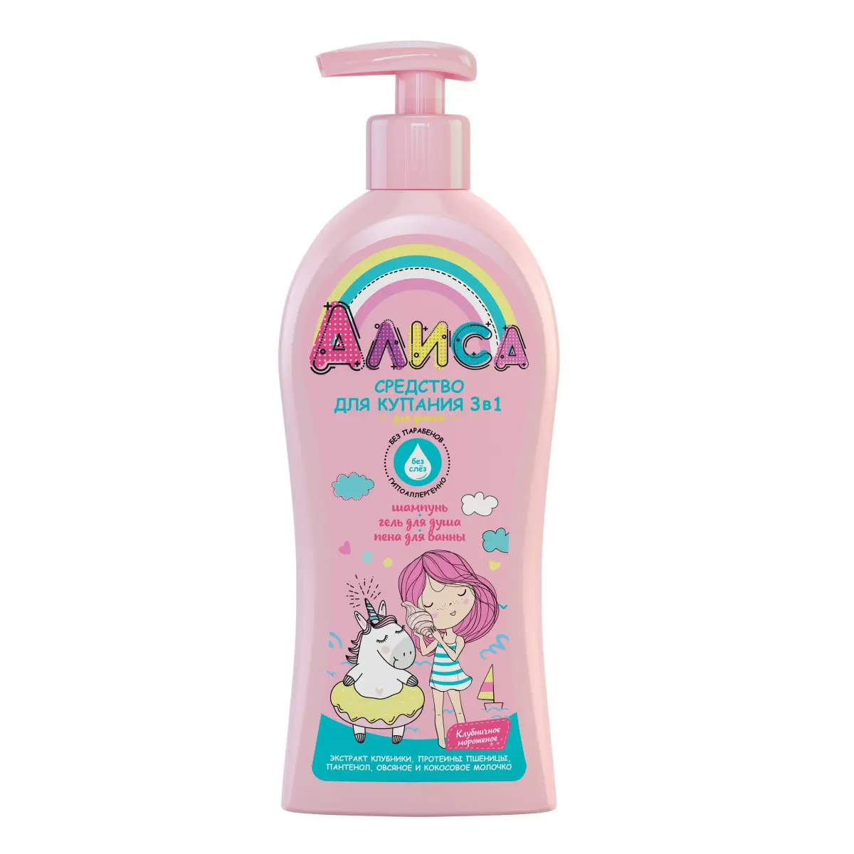 Алиса - это не просто косметика. Это история о дружбе задорной, мечтательной девочки Алисы и ее волшебного друга - белого единорога Мартина. На каждом средстве изображены яркие моменты их веселых игр, которые не оставят равнодушной ни одну маленькую мечтательницу. Кроме красочной и оригинальной упаковки специалисты АО "Свобода" позаботились и о пользе и безопасности косметических средств новой серии. Продукты серии "Алиса" сделаны на базе компонентов натурального растительного происхождения - это экстракты клубники, протеины пшеницы, пантенол, овсяное, кокосовое молочко и многое другое. Все новинки обладают приятными фруктовыми ароматами, а главное - все изделия прошли официальные клинические испытания у дерматологов, гипоаллергенны, не содержат красителей и парабенов, не вызывают слёз и обладают нейтральным уровнем pH. Средство для купания 3 в 1 заменяющий сразу шампунь, гель для душа и пену для ванны. Вода, лимонная кислота, метилизотиазолинон, кокоглюкозид, пантенол, ананаса экстракт, кокамид дэа, метилхлороизотиазолинон, глицерил олеат, парфюм, дисодиум эдта, содиум лаурет сульфат, пшеницы протеин гидролизованный