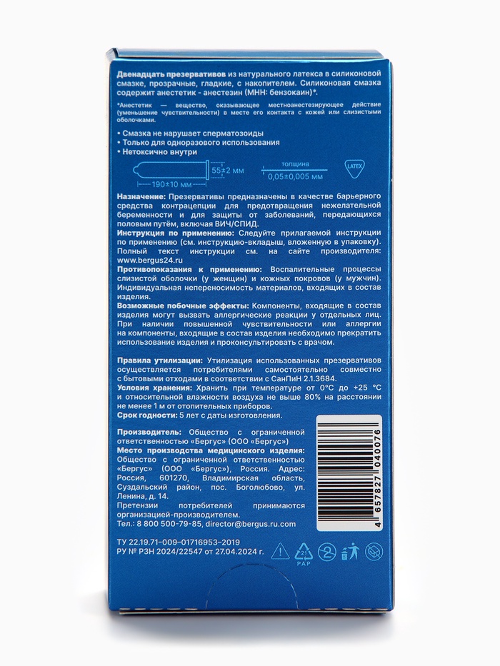 Описание: российские презервативы TOREX с пролонгирующим эффектом защищают от венерических заболеваний и предохраняют от нежелательной беременности. Благодаря большой эластичности и тонкой стенке позволяют партнёрам лучше чувствовать друг друга. Смазаны гипоаллергенной силиконовой смазкой с добавлением анестетика – бензокаина. Благодаря анестетику эякуляция у мужчины наступает значительно позже. Бензокаин является безопасным разрешённым анестетиком и не вызывает побочных эффектов. В упаковке - 12 шт. Номинальная ширина - 52 мм. Толщина стенки - 0,06 мм.