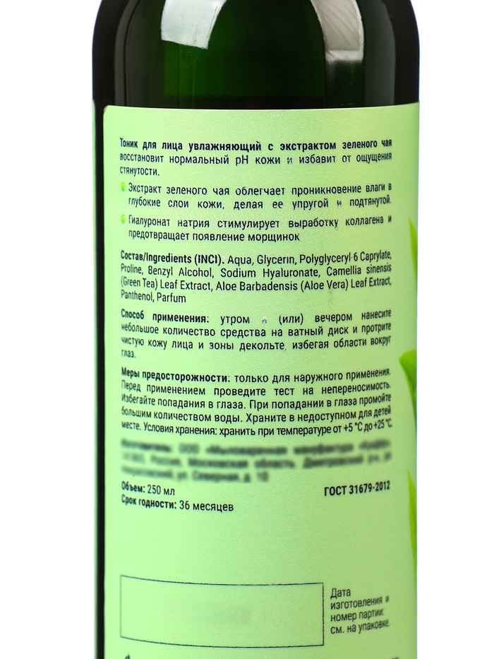 Натуральный увлажняющий тоник для лица восстановит нормальный pH кожи и избавит от ощущения стянутости. Экстракт зеленого чая облегчает проникновение влаги в глубокие слои кожи, делая ее упругой и подтянутой. Гиалуронат натрия стиммулирует выработку коллагена и предотвращает появление морщинок.