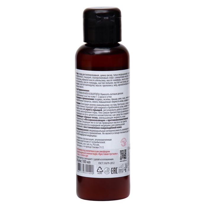 Состав: вода дистиллированная, цинка оксид, тальк медицинский, крахмал картофельный, глицерин, изопропиловый спирт, салициловая кислота, эфирное масло сосны, эфирное масло апельсина, масло камфоры, масло чёрного тмина, масло жожоба, масло лаванды, настой полыни, настой чистотела, настой ромашки, настой календулы, масло прополиса, мёд, ароматическая композиция эфирных масел.