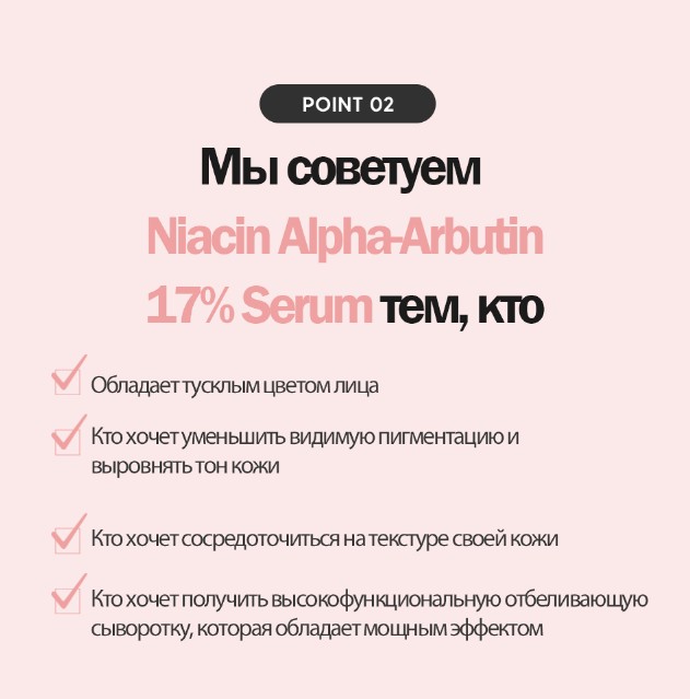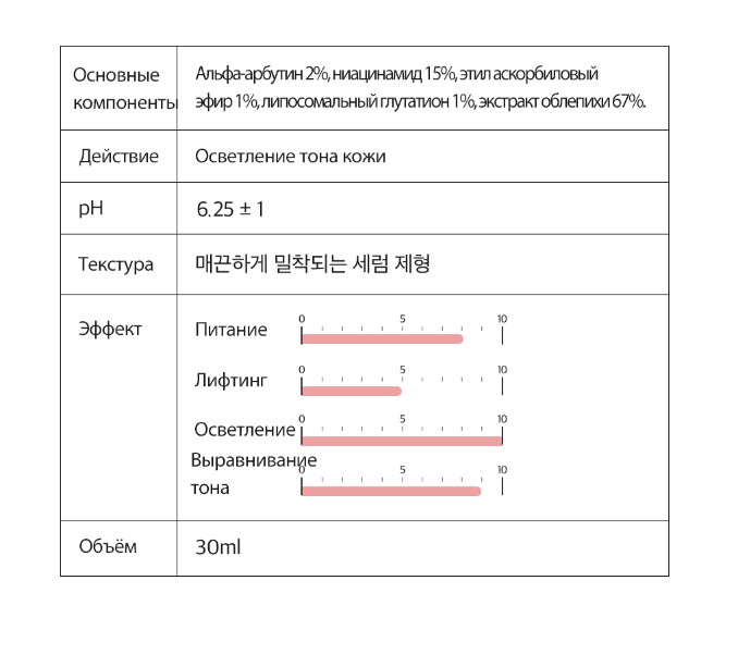 Сыворотка с ниацинамидом и альфа-арбутином мгновенно увлажняет, устраняет тусклость, выравнивает цвет лица. Осветляет пигментацию и препятствует ее появлению, поддерживает оптимальный рН (6.25).Базируется на формуле синергии, включающую 5 компонентов, устраняющих тусклость кожи. Ниацинамид восстанавливает гидробаланс, сужает поры, отбеливает пигментацию, что усилено альфа-арбутином. Облепиха витаминизирует, освежает, витамин С омолаживает, ускоряет восстановление клеток. Дополнительно сыворотка питает и оказывает лифтинг-эффект. Для любой кожи, особенно увядающей и склонной к пигментации.Способ применения: 3-4 капли сыворотки, похлопывая пальчиками, распределить по лицу.