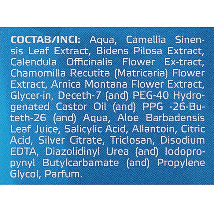 Состав: комплекс экстрактов зелёного чая, череды, календулы, ромашки, арники, гидрогенизированное касторовое масло, гель алоэ вера, салициловая кислота, аллантоин, лимонная кислота, цитрат серебра, триклозан.