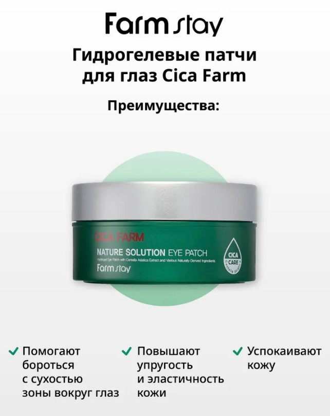 Гидрогелевые патчи с центеллой азиатской разработаны для ухода за уставшей, тусклой, повреждённой кожей вокруг глаз. Патчи устраняют стресс от внешних воздействий, например, после перелётов.