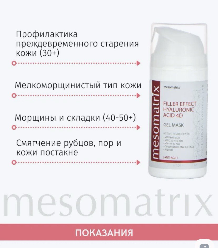 Маска-филлер дает моментальный видимый эффект, хорошо заметный после первой же процедуры. Объем, сверхувлажнение и восстановление межклеточной среды (матрикса) делают эту маску универсальным антивозрастным средством, которое подходит для решения проблем кожи от 30 до 70+.