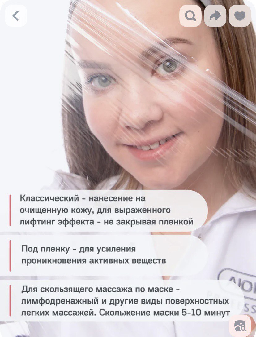 для скользящего массажа по маске - лимфодренажный и другие виды поверхностных легких массажей. Скольжение маски 5-10 минут.
