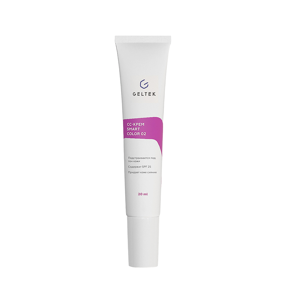 ГЕЛЬТЕК СС-крем Smart Color SPF25 02 темный тон - выравнивает тон и придает сияние, нормализует защитную функцию эпидермиса, успокаивает и восстанавливает уровень увлажненности. Подходит для всех типов кожи, включая чувствительную. Эффективен для кожи с признаками фотостарения, склонной к пигментации и покраснениям.