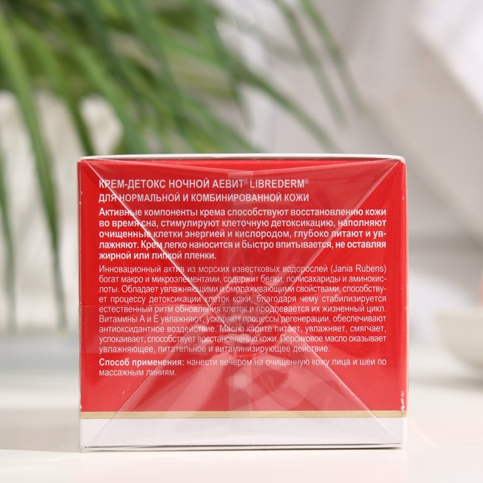 Крем-детокс ночной АЕВИТ способствует восстановлению кожи во время сна, стимулирует клеточную детоксикацию, наполняет клетки энергией и кислородом, глубоко увлажняет, питает и разглаживает мелкие морщины. Подходит для комбинированной и и нормальной кожи. Крем легко наносится и быстро впитывается, не оставляя жирной или липкой пленки. Инновационный актив из морских известковых водорослей (Jania Rubens) обладает увлажняющими и омолаживающими свойствами, способствует процессу детоксикации клеток кожи, благодаря чему стабилизируется естественный ритм обновления клеток. Витамины А и Е эффективно увлажняют, ускоряют процессы регенерации, обеспечивают антиоксидантную защиту. Масло карите питает, увлажняет, смягчает, успокаивает кожу, способствует ее восстановлению. Персиковое масло оказывает увлажняющее, питательное и витаминизирующее действие. Способ применения нанести: утром и вечером на очищенную кожу лица и шеи по массажным линиям.