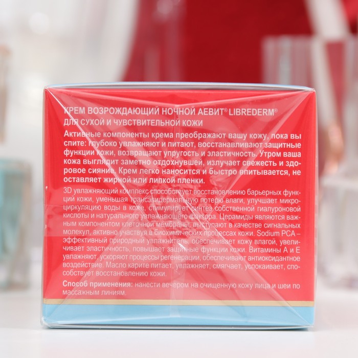 Крем возрождающий ночной АЕВИТ преображает кожу во время сна: глубоко увлажняет и питает, восстанавливает защитные функции, возвращает упругость и эластичность. Нежная текстура крема легко наносится и быстро впитывается, не оставляя жирной пленки. Подходит для сухой и чувствительной кожи лица. 3D-увлажняющий комплекс в сочетании с церамидами способствует восстановлению барьерных функций кожи, уменьшая потерю влаги, стимулирует синтез собственной гиалуроновой кислоты и натурального увлажняющего фактора (NMF). Sodium PCA, эффективный природный увлажнитель, увеличивает эластичность, повышает защитные функции кожи, ускоряет клеточный обмен веществ. Витамины А и Е эффективно увлажняют, ускоряют процессы регенерации, обеспечивают антиоксидантное воздействие Масло карите питает, увлажняет, смягчает, успокаивает кожу, способствует ее восстановлению.