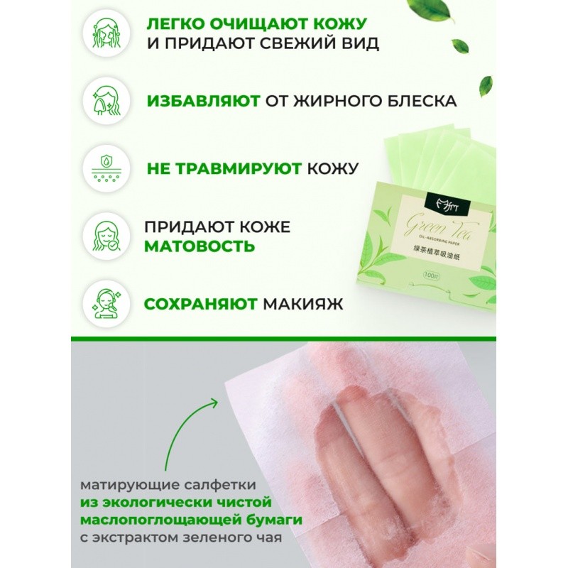 Матирующий салфетки против жирного блеска с зеленым чаем, 100 шт.