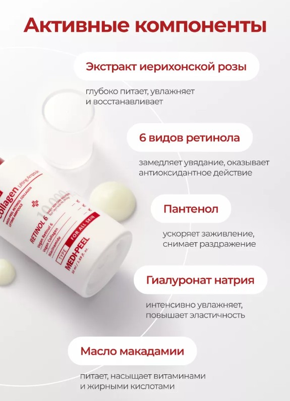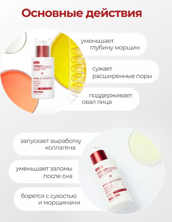 Лифтинг-ампула Medi-Peel Retinol Collagen Lifting Ampoule — это интенсивный концентрат активов с доказанной эффективностью, которые подтягивают и разглаживают кожу, уменьшают глубину морщин, сужают расширенные поры и выравнивают микрорельеф.