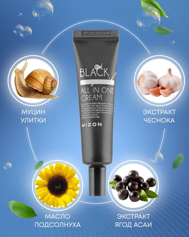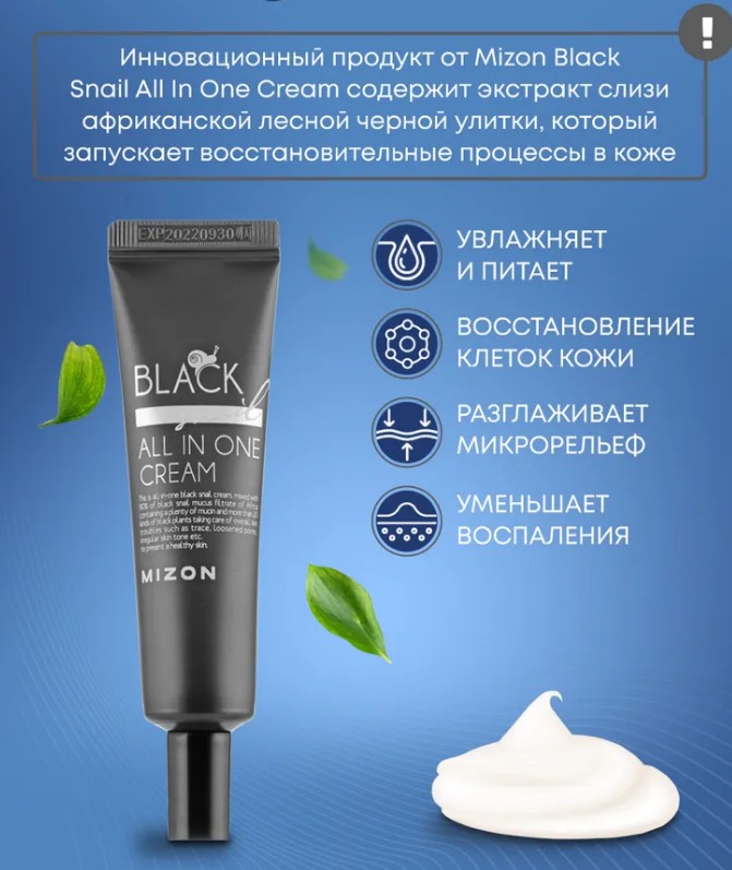 Крем для лица с экстрактом черной улитки Mizon Black Snail All In One Cream — многофункциональное средство, которое обладает заживляющим, противомикробным, успокаивающим, увлажняющим и оздоравливающим действием. Крем помогает бороться с угревой сыпью, рубцами, шрамами, возрастными пятнами, расширенными порами, а также замедляет процессы увядания кожи.
