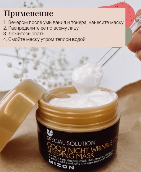 Антивозрастная ночная маска для лица, которая восстанавливает увядающую дерму, разглаживает мимические и возрастные морщины, улучшает барьерные функции кожи. В состав продукта не входят вредные компоненты, такие как спирты, парабены и искусственные ароматизаторы. Маска содержит трипептид меди-1, который способствует регенерации клеток, сокращает количество и глубину морщинок. Входящий в состав аденозин продлевает молодость и красоту дермы, препятствует появлению новых морщин. Коллаген помогает восстановить естественный баланс коллагена в клетках кожи, делая ее упругой и эластичной. АНА и ВНА-кислоты действуют в комплексе: одна проникает в глубокие слои эпидермиса, а другая буквально «полирует» его снаружи, удаляя ороговевший слой кожи и устраняя неровный тон. Ретинол улучшает состояние проблемной кожи, успокаивает воспаления, устраняет тусклый цвет лица. Протеины пшеницы поддерживают увлажнение эпителия и действуют как активные кондиционирующие агенты для кожи. Кроме того, маска содержит комплекс натуральных