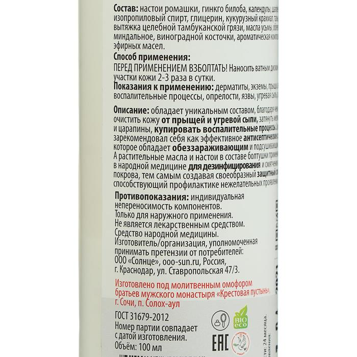 Монастырская болтушка с цинком обладает уникальным составом, благодаря чему может очистить кожу от прыщей и угревой сыпи, затянуть мелкие раны и царапины, купировать воспалительные процессы. Цинк издавна зарекомендовал себя как эффективное антисептическое средство, которое обладает обеззараживающим и подсушивающим свойствами. А растительные масла и настои в составе болтушки применяются в народной медицине для дезинфицирования и смягчения кожного покрова, тем самым создавая своеобразный защитный слой, что способствует профилактике нежелательных проявлений.