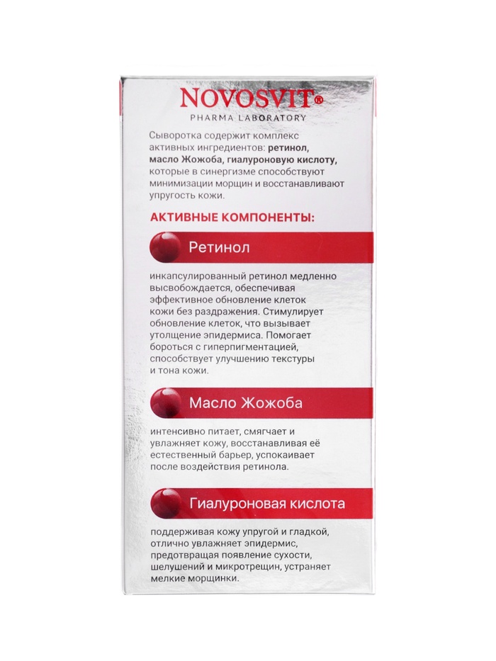 Сыворотка NOVOSVIT с инкапсулированным ретинолом — это инновационное средство для комплексного омоложения и восстановления кожи. Формула средства создана для бережного обновления кожи без раздражений: ретинол постепенно высвобождается, стимулируя обновление клеток, утолщение эпидермиса и борьбу с гиперпигментацией. В результате кожа выглядит более гладкой, упругой и сияющей, а морщины становятся менее заметными.