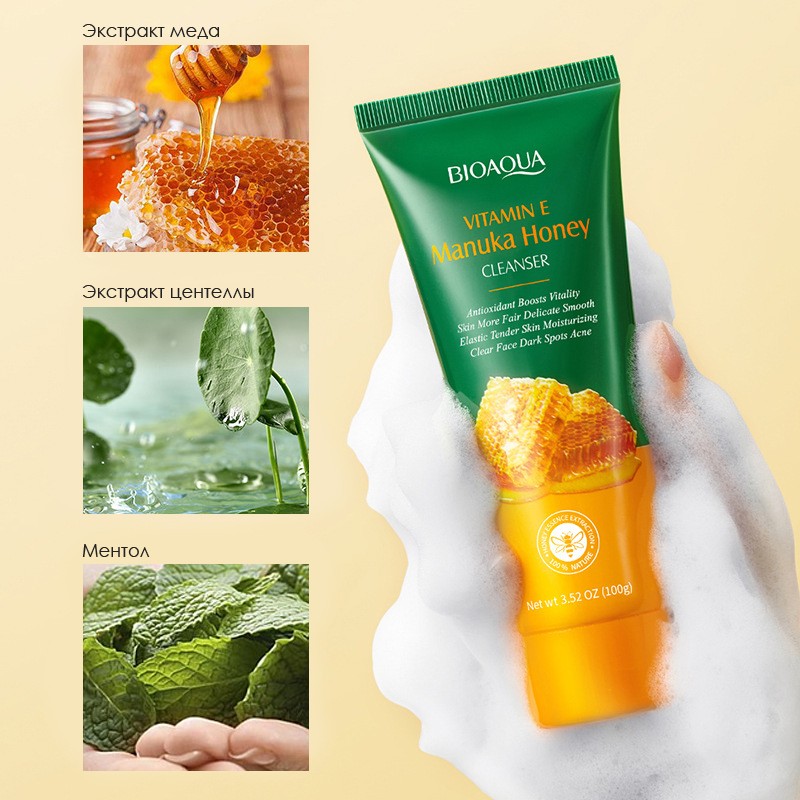 Пенка для умывания с экстрактом меда и ви..показатьтамином Е Bioaqua тщательно очистит лицо от пыли, остатков косметики и излишков себума. Эффективно очищает кожу без ощущения сухости и стянутости.Пенка регулирует работу сальных желез, подавляет излишнюю выработку кожного жира, предупреждает появление блеска.Экстракт меда замечательно питает кожу, смягчает и увлажняет, оказывает подтягивающее и тонизирующее действие, делает ее упругой и эластичной.Витамин Е (токоферол) уменьшает проявление пигментации, убирает покраснения.Центелла азиатская удерживает влагу в эпидермисе, укрепляет барьерные функции.Ментол сужает поры, улучшает микроциркуляцию крови в капиллярах.