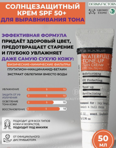 600рDERMA FACTORY WATERFUL TONE UP SUN CREAM Spf 50+, Pa+++ Увлажняющий и выравнивающий тон солнцезащитный крем 50г