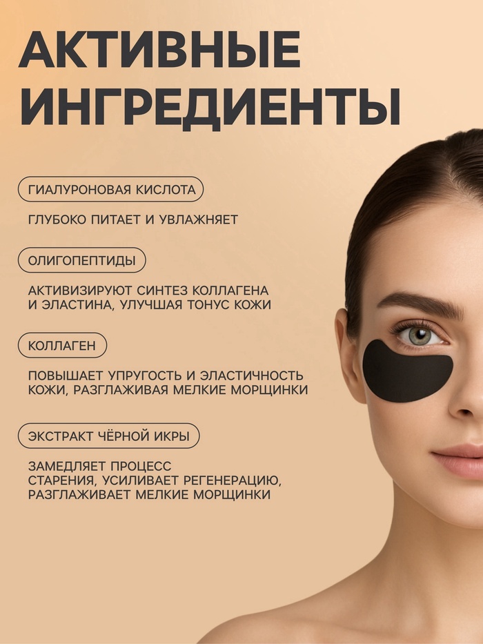 Гидрогелевые патчи на основе черной икры плотно прилегают к коже, наделяя её полезными веществами, входящими в состав. Они борются с отечность, делают темные круги менее выраженными, напитывают кожу влагой и наполняют её витаминами, а также подтягивают кожу вокруг глаз.