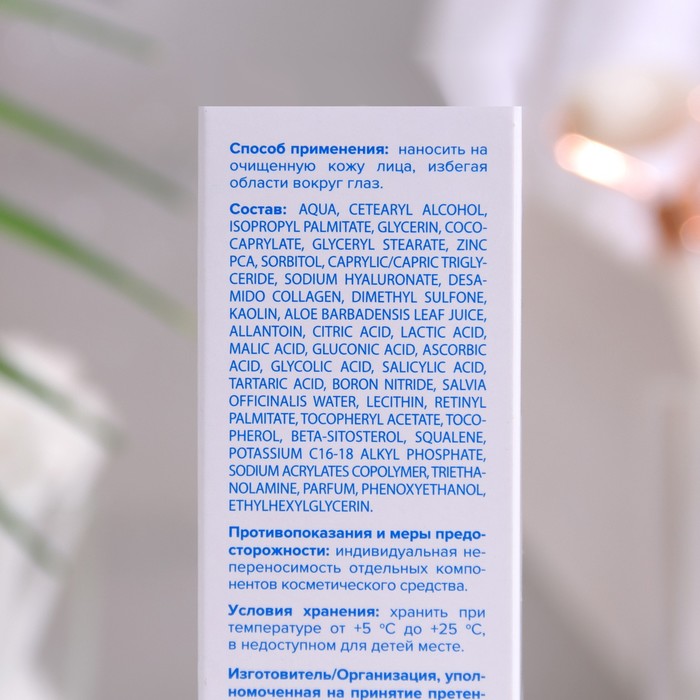 Состав: aqua, cetearyl alcohol, isopropyl palmitate, glycerin, coco-caprylate, glyceryl stearate, zinc PCA, sorbitol, caprylic/capric triglyceride, sodium hyaluronate, desamido collagen, dimethyl sulfone, kaolin, aloe barbadensis leaf juice, allantoin, citric acid, lactic acid, malic acid, gluconic acid, ascorbic acid, glycolic acid, salicylic acid, tartaric acid, boron nitride, salvia officinalis water, lecithin, retinyl palmitate, tocopheryl acetate, tocopherol, beta-sitosterol, squalene, potassium C16-18 alkyl phosphate, sodium acrylates copolymer, triethanolamine, parfum, phenoxyethanol, ethylhexylglycerin.