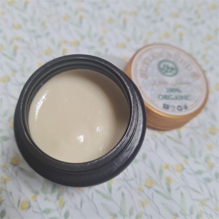 Состав: оливково-лавровая эмульсия, взбитое масло карите, взбитое масло кокоса, растительные масла холодного отжима: масло брокколи, масло бораго, масло вечерней примулы (Oenothera biennis) , масло моркови (Daucus carota), жожоба воск, масло миндаля, зародышей пшеницы, масло авокадо, гидролат листа подорожника, слизь пустынной улитки, гидролизат шелковых коконов, рисовый воск, цветочный воск, пудра сандала, пудра бензоина суматранского (Styrax sumatranum).