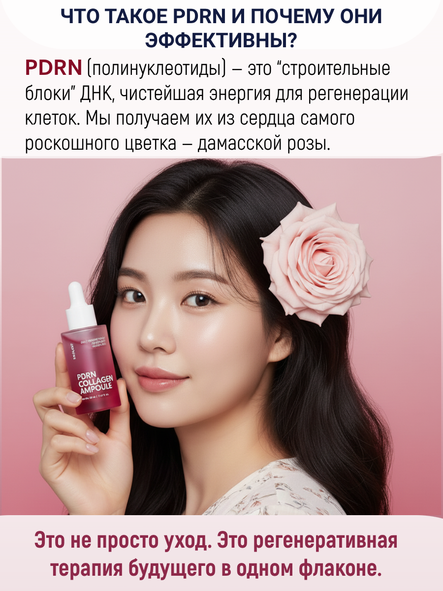 PDRN (полинуклеотиды 0.5ppm), полученные из ДНК дамасской розы, и гидролат розы (14,700ppm): Этот уникальный дуэт работает на клеточном уровне, запуская процессы регенерации, стимулируя выработку собственного коллагена и эластина. Результат — заметное уплотнение кожи и разглаживание морщин.