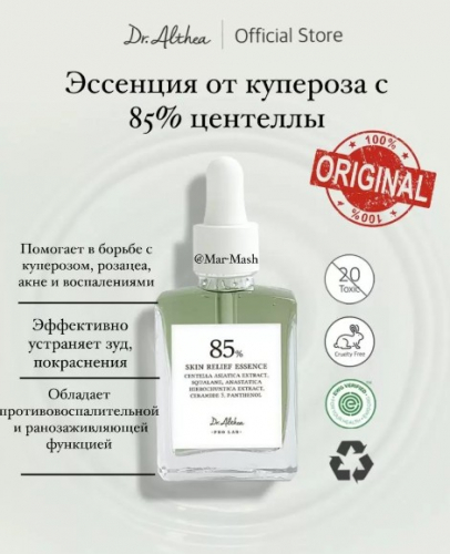 Экстракт центеллы азиатской снижает реактивность кожи, уменьшает раздражение, снимает зуд и покраснение. Оказывает сосудоукрепляющее действие, уменьшает отёки — эффективен в профилактике купероза.