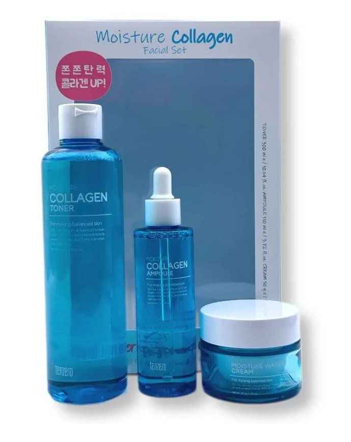 TENZERO MOISTURE COLLAGEN FACIAL SET Набор: Увлажняющий тонер для лица с коллагеном, Увлажняющая сыворотка для лица с коллагеном, Увлажняющий крем для лица с коллагеном 708г. Набор включает тонер, сыворотку и крем для ухода за кожей лица. Все они содержат коллаген, который увлажняет и укрепляет кожу, устраняя шершавость, обезвоживание, дискомфорт, возникающий из-за сухости. Средства обеспечивают минимальный, но эффективный уход, возвращая эпидермису утраченную упругость, расправляя морщинки, уменьшая глубину складочек. Тонера и сыворотка усиливают увлажнение, а крем дополнительно питает и защищает. Набор подходит для любой кожи, особенно сухой, увядающей.