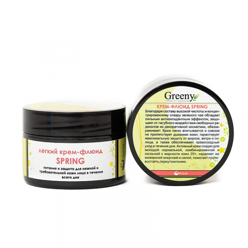 Крем-флюид Greeny «The Spring» - дает нежной и требовательной коже необходимое питание и защиту в течение всего дня. Благодаря составу высокой чистоты и концентрированному отвару зеленого чая обладает сильным антиоксидантным эффектом, защищает от пагубного воздействия свободных радикалов из декоративной косметики, обеззараживает. Крем легко впитывается и совсем не препятствует дыханию кожи; гарантирует максимальную защиту от мороза, ветра и солнца, а также обеспечивает превосходный уход в течение дня. Активные компоненты (СО2 экстракты, эфирные масла, цитрусовый микс) насыщают кожу витаминами, увлажняют, активизируют природную барьерную функцию и помогают бороться с внешними раздражителями, ставящими под угрозу молодость вашей кожи. Текстура: богатая, но чрезвычайно лёгкая, не оставляющая ощущения «маски». Активный крем создан для молодой нормальной, комбинированной и склонной к жирности кожи 20+, наделяет ее жизненной энергией и силой, помогает противостоять переутомлению. Примечание: Флюид - это дневной крем, но более легкой, воздушной, не жирной текстуры. Отличается мгновенной впитываемостью и небольшим расходом. Под флюид можно применять сыворотку. А вот нанесение дополнительных увлажняющих кремов уже не требуется. Состав: Масла Ши, кокоса, виноградной косточки, миндаля. Вода с коллоидами серебра. Пектин. Глицерин. Пюре сырого огурца, тыквы, апельсина. Экстракт зеленого чая. Косметическая основа «Липодерм БИО». Стеариновая кислота. Отвар золотого корня, ромашки, рябины. Ксантановая камедь. Эфирные масла эвкалипта, иланг-иланг. Применение: Нанести 5гр. флюида на кожу лица, шеи, область век, слегка помассировать. Флюид впитывается полностью. Используется как самостоятельный дневной крем, крем-уход, основа под нанесение декоративной косметики, альгинатных масок. Подходит для ежедневного применения. Хранить при температуре +2/+20 вдали от солнечного света, после вскрытия рекомендуется хранить в холодильнике.