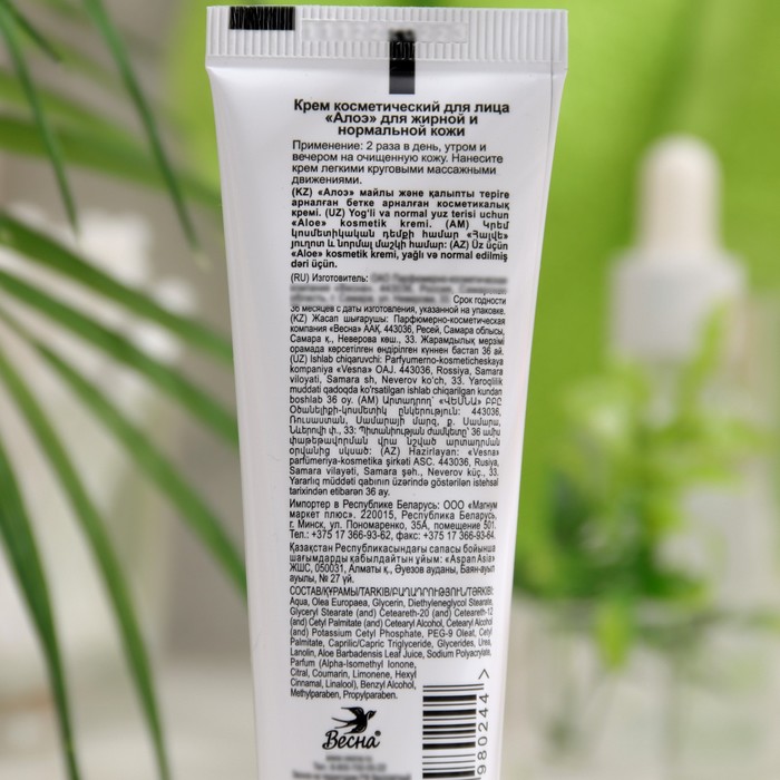 Предназначен для ухода за нормальной, жирной кожей. Консистенция легкая в мягкой тубе, запах нежный, косметический, цвет белый, без вкраплений,. Входящие в состав экстракт алоэ вера и специально подобранный увлажняющий комплекс тонизируют, способствуют поддержанию в норме воднолипидного баланса. Крем увлажняющий препятствует старению клеток, стимулирует их регенерацию, разглаживает мелкие морщинки, устраняет раздражения, шелушения, активно смягчает, эффективно, сбалансированно питает, успокаивает дерму, возвращает ей естественный цвет. Крем для лица с Алое делает кожу мягкой, увлажненной, бархатистой, напитанной, проходят шелушения. Крем для лица быстро впитывается, не оставляет жирного блеска, ощущения липкости, не забивает поры. Подойдет в качестве основы под макияж.